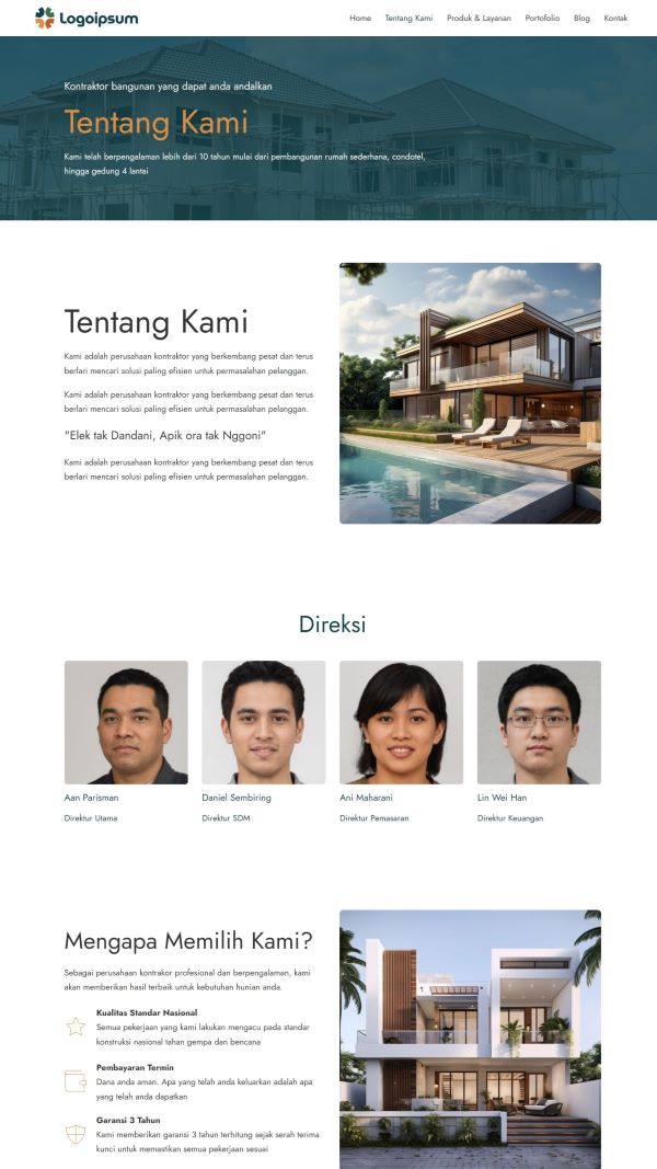 Di sini, kita mulai mendesain halaman Tentang Kami dengan berbagai section berikut secara detail