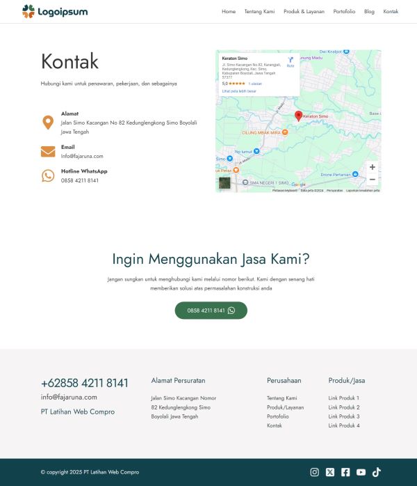 Di sini, kita mulai mendesain halaman Kontakdengan berbagai section berikut secara detail